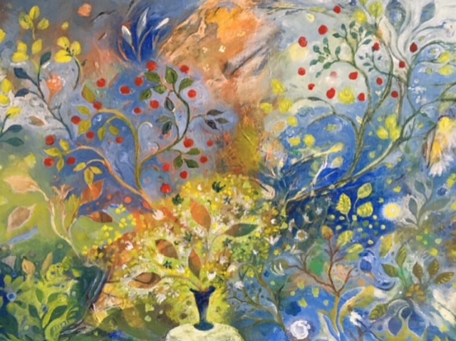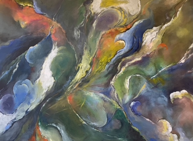 Elijah is part of a series on Jewish themes of Torah inspired spiritual transcendence. This one is particularly mystical for me in the way it came about. I had no idea what I would be painting and only knew I’d dedicate this one (30″x40″ mixed media on linen) to Elijah. I wrote “Elijah” on the back of the linen before starting to paint. The painting was curious, action-filled and strange in that I was not at all sure where it was going and the structure was not typical for me in abstracts I have previously created. After working on it in a very physical way for a while, I knew it was finished. I decided I should read about Elijah. The very first sentence I saw surprised me. I had not recalled this particular expression about Elijah. It read, “Elijah went up to heaven in a whirlwind.” This astounded me in a powerful way–now the image made sense! The entire painting is a whirlwind. I felt strongly that Elijah had become a part of this painting once I dedicated to him.