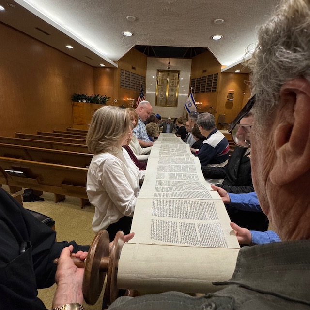 (Photo by Ilene Kent) A picture from Simchat Torah this year at the historical Temple Israel in Columbus, Georgia, we joined together in the sacred celebration of rolling out the Torah to start anew (at the beginning again). It is said that the letters written in the Torah are that which, in our created world, is visible to us. And the page they are inscribed upon is the “white fire” of that which we cannot see. There is much to see, do and perceive that is obvious to work with in life–our basic structures we dwell within, but what about the mysterious aspects of life we cannot perceive? Often we wait until clarity comes and often we may never quite “see” or understand.